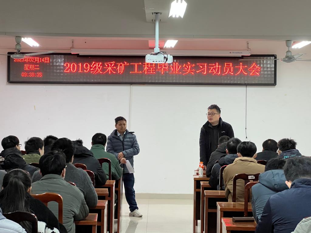 本网讯 为进一步做好学生毕业实习工作,引导学生做到安全有序,推进毕业实习工作的顺利开展。214日,我院在黄金校区逸夫楼第二会议室召开2019级采矿工程专业毕业实习动员大会。采矿工程系主任曾鹏、副主任陈青林、带队教师以及采矿工程、采矿工程(中外)专业2019级全体同学参加了此次会议。会议由陈青林主持。