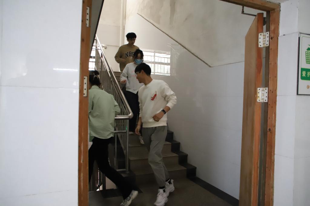 演练时,所有参加人员在办公、上课、学习、实验一切如常。随着警报响起,各楼层指挥员立即跑至每个房间并指挥全体人员迅速有序的离开房间。在有序指挥下,老师和同学们纷纷迅速弯腰、靠墙、捂住口鼻,严格按照正确的逃生姿势从东面楼梯靠右有序下楼到一楼空地处集合,到达安全地区。随后各指挥员在逸夫楼1楼东面安全出口外的排球场清点人数。