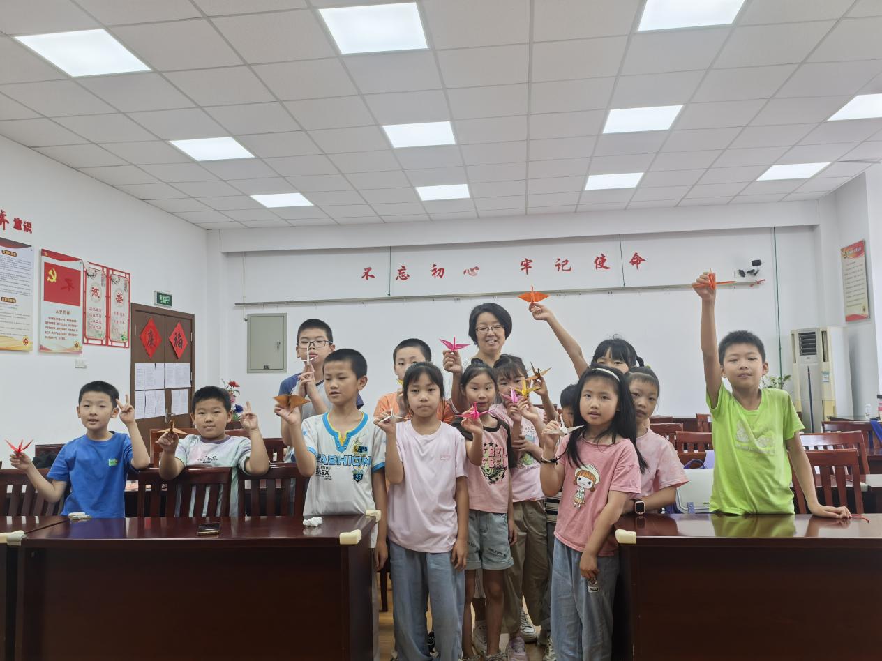趣味折纸中,孩子们认真学习纸鹤的折法。合影留念时,孩子们将手中的纸鹤高高举起,脸上洋溢着天真烂漫的笑容。