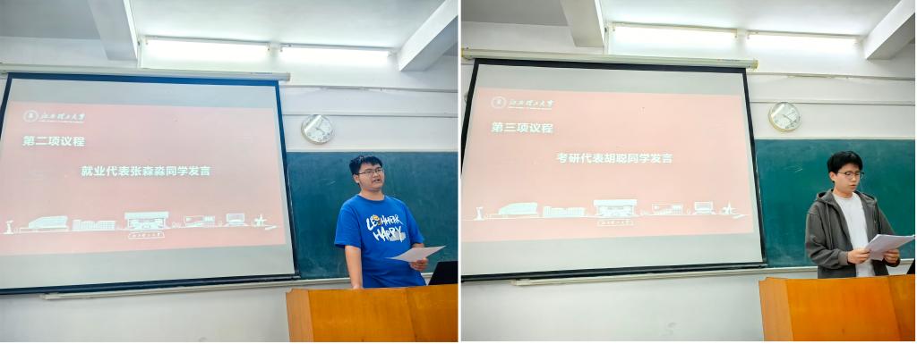 紧接着,考研代表和就业代表分别上台分享各自的经验和心得。考研代表提到,考研是一条充满挑战的道路,但同时也是成长和进步的机会,他建议同学们制定合理的学习计划,保持良好的心态,面对挑战坚持不懈;就业代表则分享了找工作的经验,他建议同学们通过老师或学校就业信息网了解就业形势和招聘信息,对公司进行初步了解,以充分准备面试,他还强调积极心态的重要性,并提醒同学们在面试时注意言行举止。