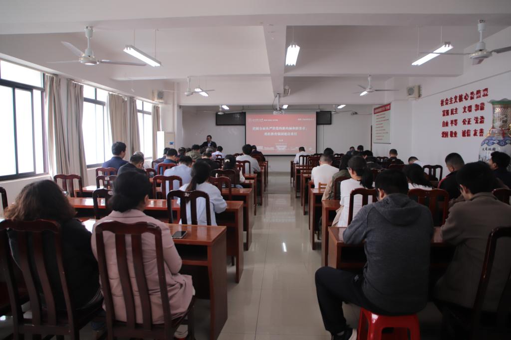 本网讯 4月8日,为了加强教职工对全面从严治党的新内涵和新要求的认识,学院于黄金校区逸夫楼第二会议室召开教职工政治理论学习会议,学院全体教职工参加此次会议。会议由学院党委书记陈明主持。
