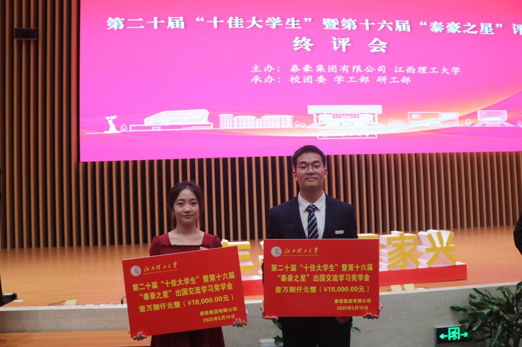 经过激烈比拼,资源与环境工程学院环境211班匡奕、2022级矿业工程博士研究生李贞栋从20名终评候选人中脱颖而出,被授予第二十届“十佳大学生”暨第十六届“泰豪之星”荣誉称号,并奖励出国交流学习奖学金18000元。同时,在此次评选中,资源与环境工程学院也是唯一有两名获奖学子。