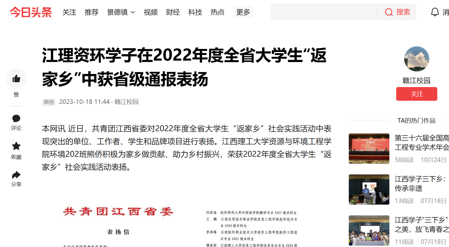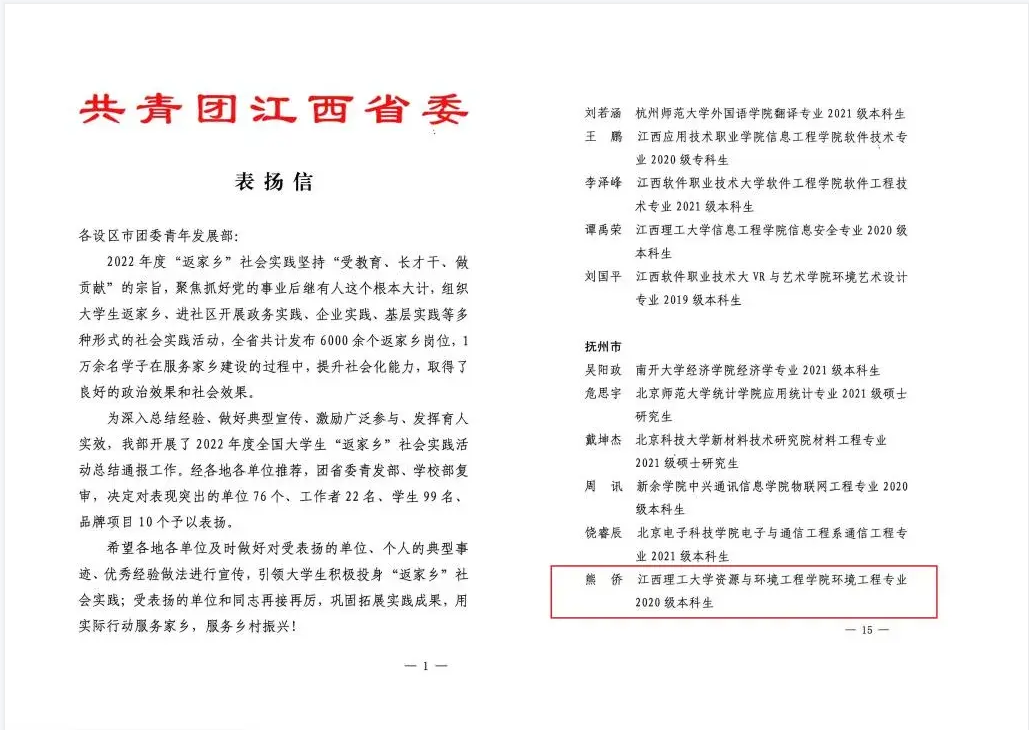 本网讯 近日,共青团江西省委对2022年度全省大学生“返家乡”社会实践活动中表现突出的单位、工作者、学生和品牌项目进行表扬。华体会网页版登录入口环境202班熊侨积极为家乡做贡献、助力乡村振兴,荣获2022年度全省大学生“返家乡”社会实践活动表扬。