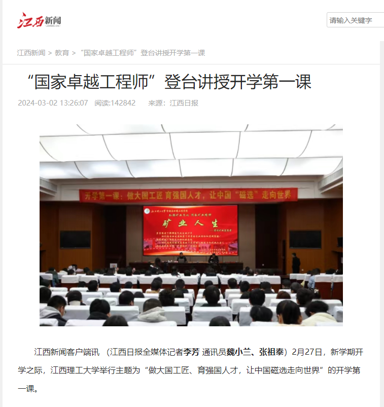 江西新闻客户端讯 (江西日报全媒体记者李芳 通讯员魏小兰、张祖泰)2月27日,新学期开学之际,江西理工大学举行主题为“做大国工匠、育强国人才,让中国磁选走向世界”的开学第一课。