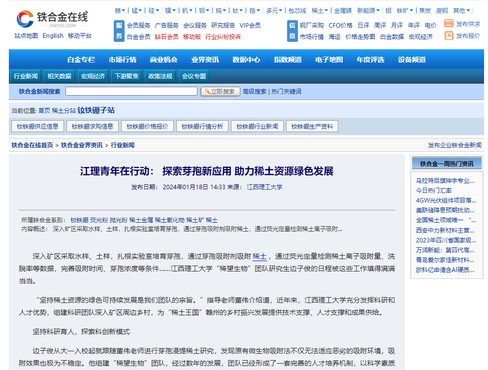 深入矿区采取水样、土样,扎根实验室培育芽孢,通过芽孢吸附剂吸附稀土,通过荧光定量检测稀土离子吸附量、洗脱率等数据,完善吸附时间、芽孢浓度等条件……江西理工大学“稀望生物”团队研究生边子俊的日程被这些工作填得满满当当。