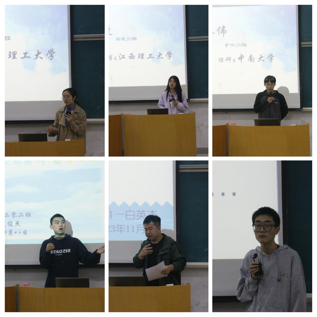 直博本校环境专业的环境203班肖婕回顾了大学生活的种种经历,向学弟学妹们分享了大学生活的趣事,也向大家讲解了大学生考研与保研的重点,她着重强调大学生要注重绩点成绩与参与学科竞赛;矿加201班滕伟就各种学科竞赛做出补充,从大一到大四的竞赛项目以及自己的任职经历,告诉同学们要多去参与竞赛;矿加202班武俊杰向学弟学妹们介绍了大学四年获得的荣誉与成就,讲述了自己在大学里的生活,希望学弟学妹们能多参与学校活动,充实自己的大学生活,在努力学习的同时,多学习更多课外知识;采矿201班白英杰从设定目标、人际关系、学习方法、兴趣爱好四个方面告诉同学们该怎样度过自己的大学生活;环境203班刘结邻向同学们分享了自己保研的经历,就如何提高自己,实现目标,提出了自己的建议,希望同学们能规划好自己的大学生活;地质201班张世哲回顾了大学四年生活,建议学弟学妹们多去学习一些应用软件,将学习目标贯彻到底,每天都要有事可干,不荒废时间。