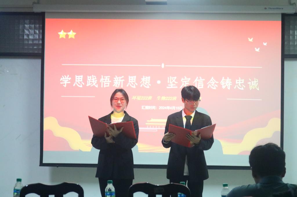 本网讯 4月15日,我院在黄金校区逸夫楼第二会议室举办了“学思践悟新思想,坚定信念铸忠诚”观摩“双学”活动。学院副院长陈飞辅导员赖华、张小普、刘黎明班主任潘涛、宋本如,学校观摩“双学”评议小组成员以及学院各年级团支部代表参加了此次活动。本次活动由学院地质221团支部、环境222团支部、生物222团支部共同承办。