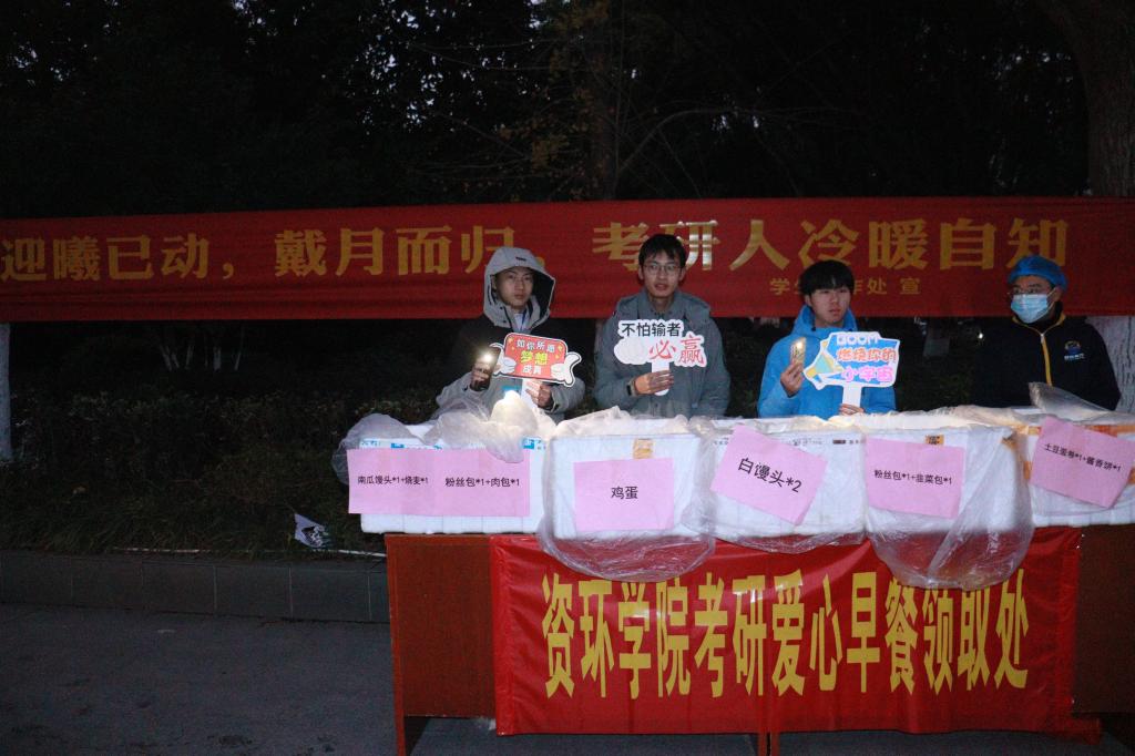 天还未亮,辅导员和志愿者引导考研送考大巴车在指定地点停放,并组织志愿者们搬运爱心早餐和做好引导工作。考研学子们陆续在志愿者的指引下挑选自己喜欢吃的爱心早餐。