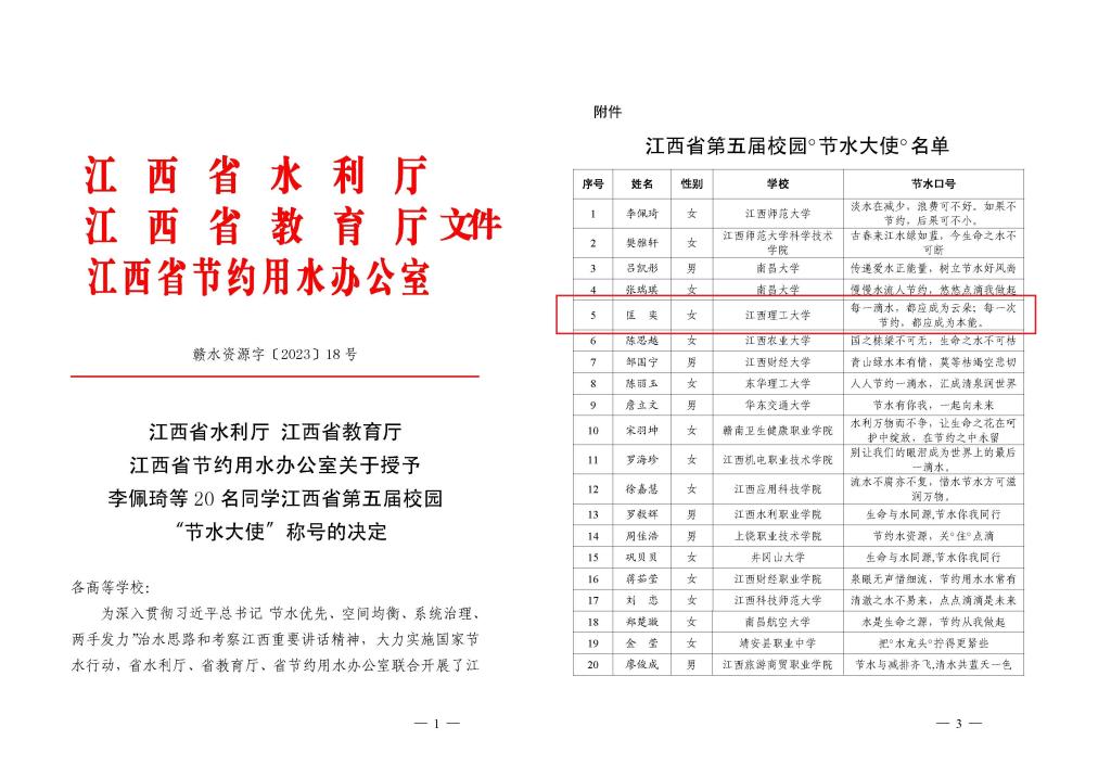 本网讯 近日,江西省水利厅、江西省教育厅、江西省节约用水办公室联合发布《关于授予李佩琦等20名同学江西省第五届校园“节水大使”称号的决定》(赣水资源字〔2023〕18 号),我院环境211班匡奕荣获了江西省第五届校园“节水大使”称号,是学校唯一获奖。