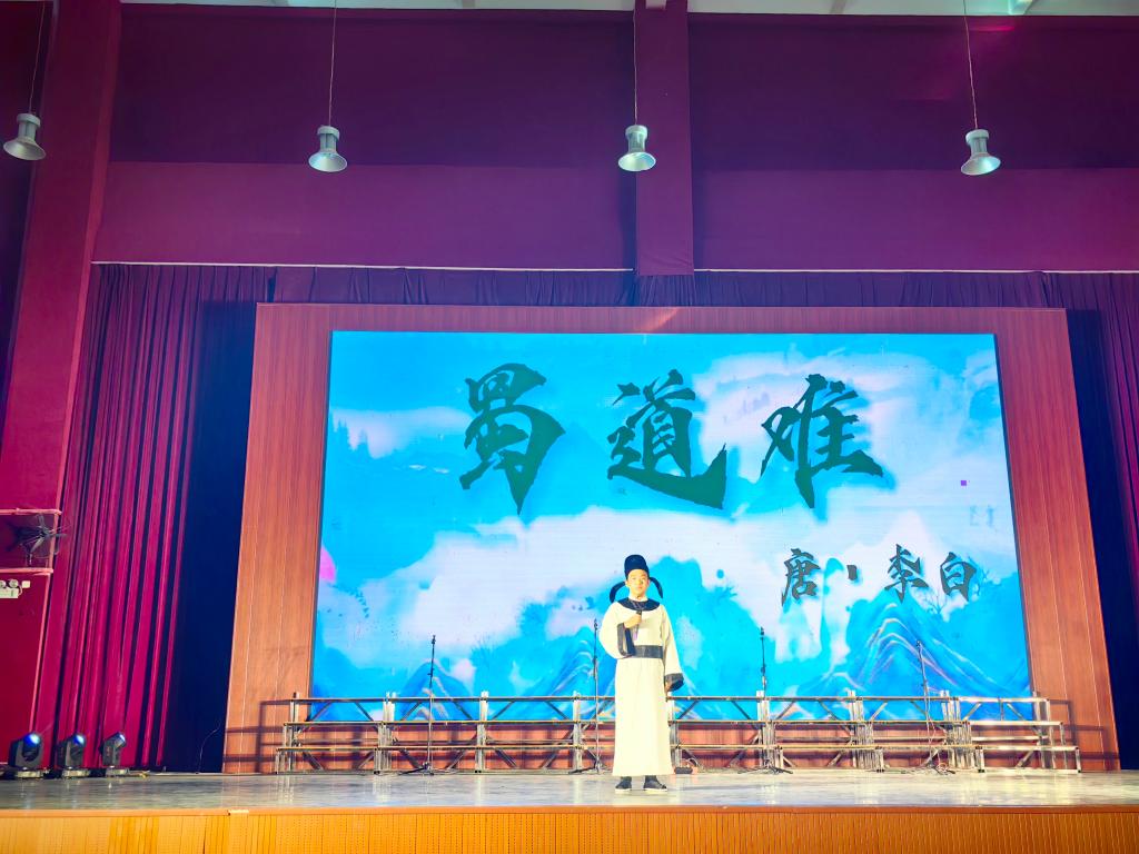 舞台上,土木与测绘工程学院测绘221康昆诗朗诵作品《蜀道难》交织着李白奔放的激情和矛盾的思想,诵出了蜀道驳杂的路途,道尽蜀道之艰险,吟咏了祖国壮丽的河山!