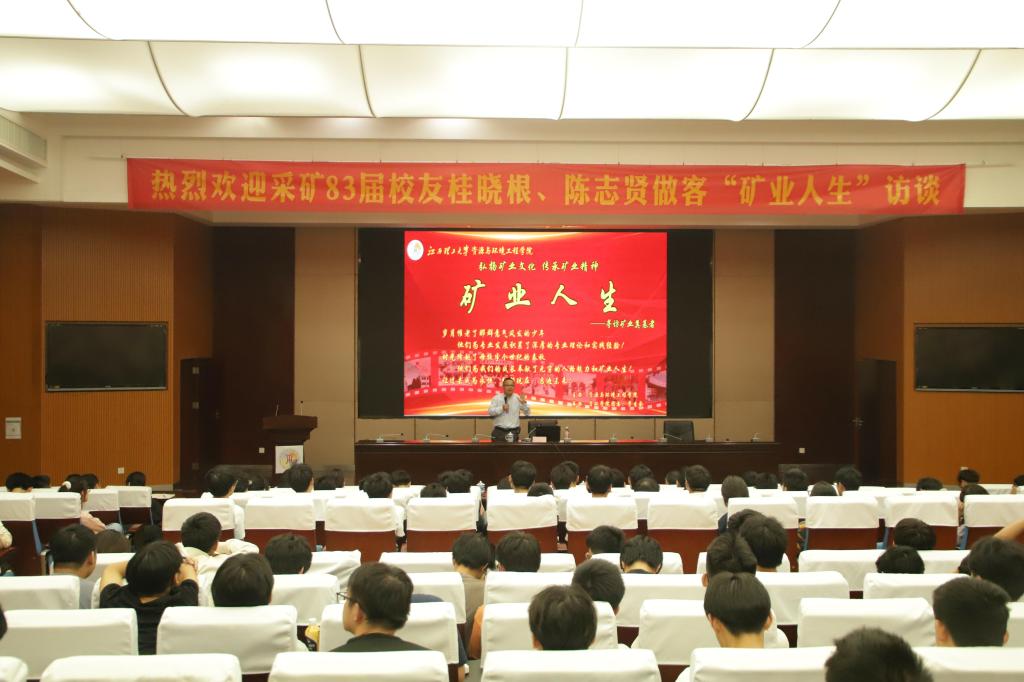 本网讯 9月24日,我院采矿工程专业83届校友桂晓根、陈志贤受邀做客我院“矿业人生”访谈,在黄金校区逸夫楼学术报告厅以“同宿舍校友共同演绎‘江西理工人’的情怀与担当”为主题,与师生共话自己在矿业领域的风雨兼程与辉煌成就。学院院长何桂春,辅导员刘浩、张吉勇以及各专业研究生、本科生近300人参加了访谈。访谈由何桂春主持。