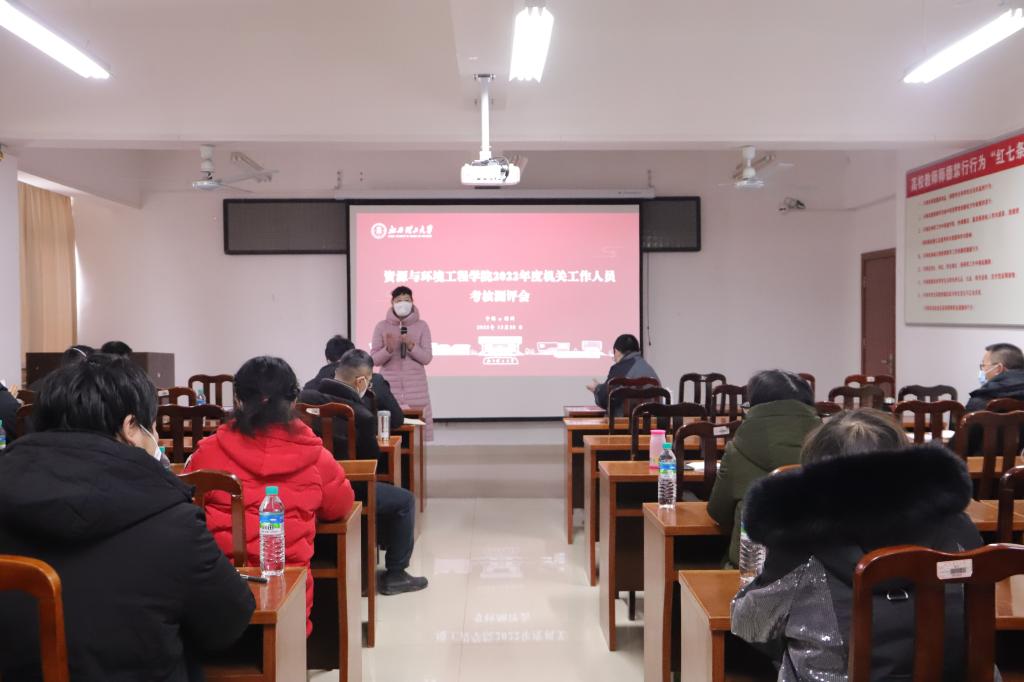 本网讯 12月28日上午,资源与环境工程学院于黄金校区逸夫楼第二会议室召开2022年度机关工作人员述职、测评会议。资源与环境工程学院院长何桂春、党委书记陈明、党委副书记饶先发、副院长陈飞、余新阳以及各系/教研室主任、教工党支部书记、全体机关工作人员参加了此次会议。会议由何桂春主持。
