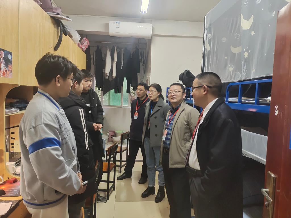 本网讯 2月12日,新学期返校最后一天,我院院长何桂春、党委书记陈明、党委副书记饶先发、副院长陈飞、余新阳走访黄金校区、红旗校区学生宿舍,学院学工办相关老师陪同走访。