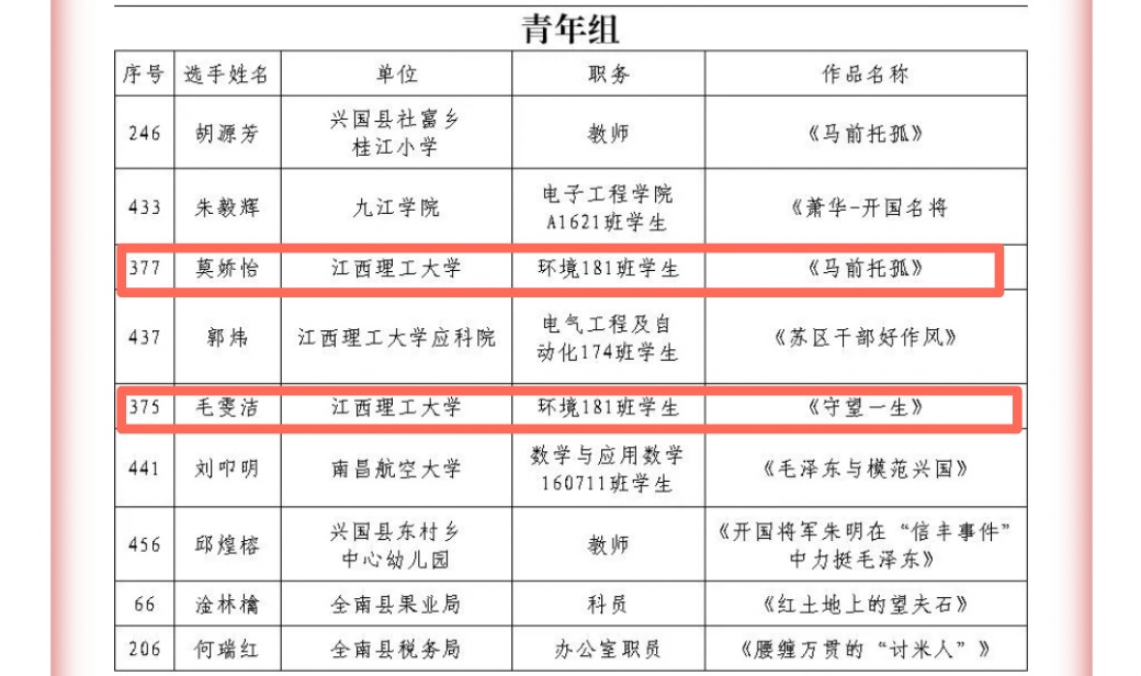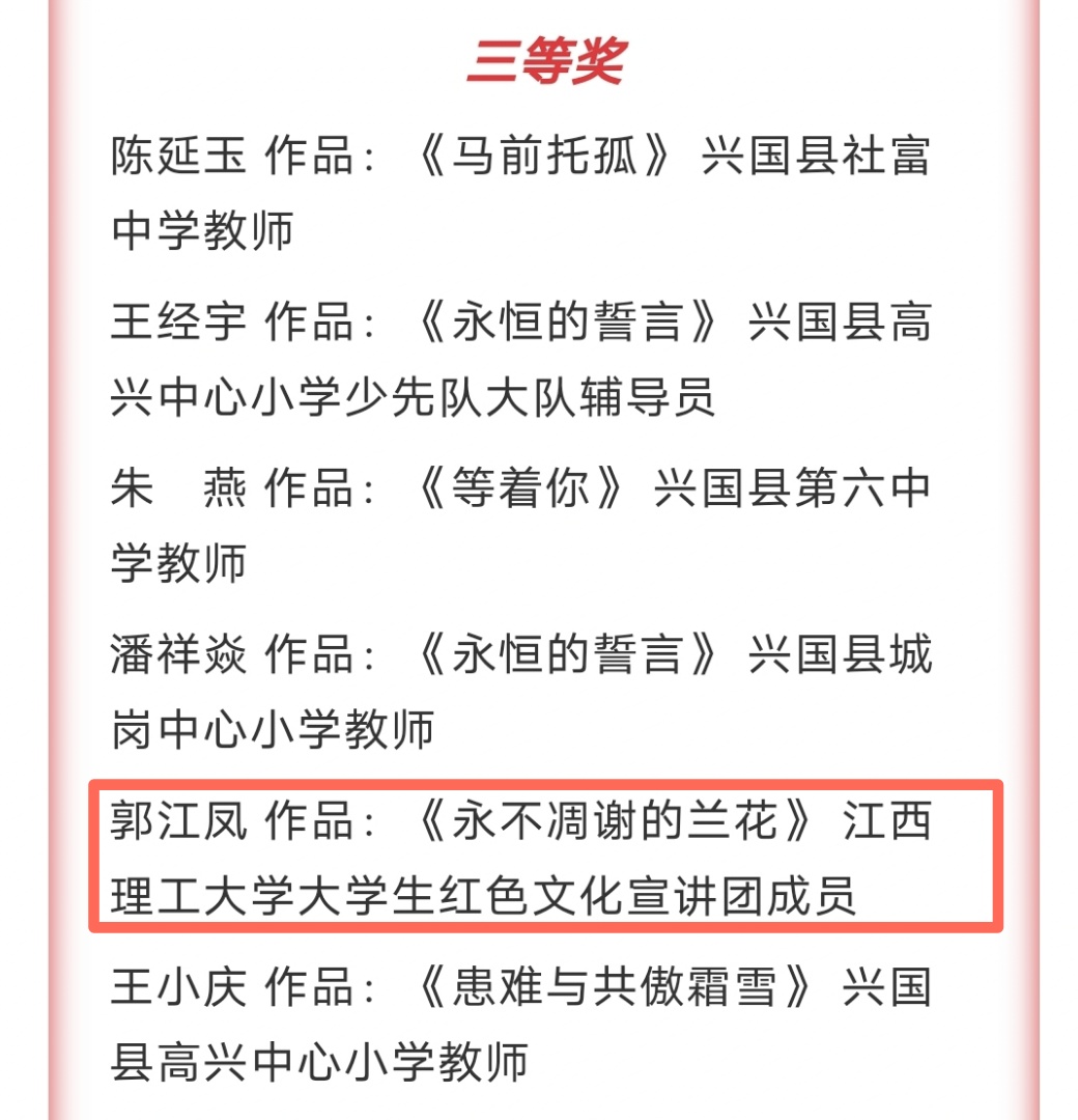 本次评审秉着公正公开的原则,市委党史办主任胡日旺担任主评委,来自赣州市中央苏区研究中心、赣州市青少年活动中心、兴国县教科体局、兴国县融媒体中心等单位的专家评委对入围作品进行逐个评审点评。其中我院大学生红色宣讲团成员、矿加181班郭江凤的参赛作品《永不凋谢的兰花》荣获青年组三等奖,大学生红色宣讲团成员、环境181班莫娇怡的参赛作品《马前托孤》和大学生红色宣讲团成员、环境181班毛雯洁的参赛作品《守望一生》获得青年组优胜奖。