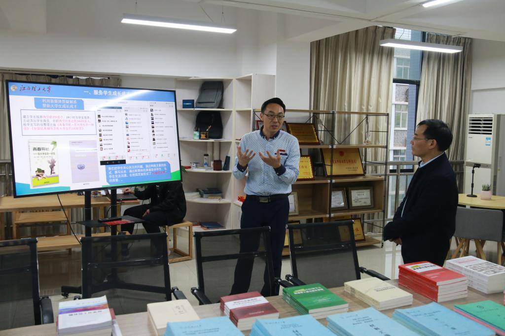 钟小武一行首先参观了我院“红心环语”辅导员工作室。饶先发介绍了工作室对辅导员工作、学生培养方法以及取得的成果,并展示了学院自行编辑出版的一系列教育书籍。在讲解的过程中,双方就辅导员培训等内容进行深入交流。